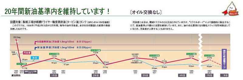 下のグラフは製紙工場で高粘度の軸受け潤滑油の長期試験データです。